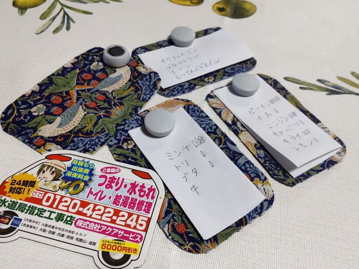 自宅まで迅速に駆けつけてくれる水回り修理業者さんからのお知らせマグネット、捨てるのはもったいないですよね!そこで、このマグネットを自分好みのデザインにカスタマイズし、冷蔵庫の在庫メモができるお洒落なマグネットシートに変身させます。