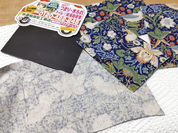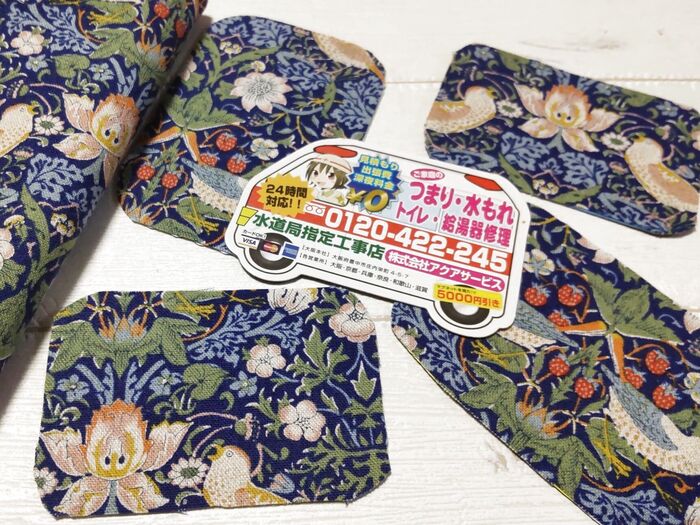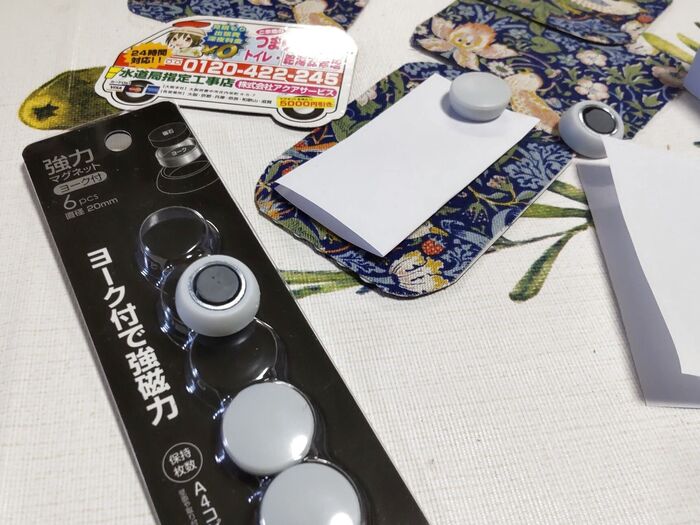 まず、布の裏側に水回り修理業者さんからのお知らせマグネットを置き、えんぴつで一周ガイドラインを引きます。このとき、絵柄が裏側から透けて見えることが多いので、お好みのデザイン部分を選んで線で囲んでくださいね。