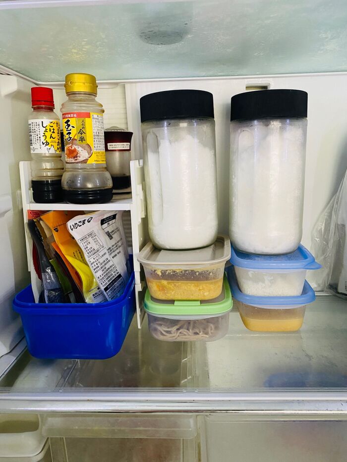 そんな時は、安定感のある保存容器(主におかずが余ったもの入っています)を下にして瓶に入っている粉ものや砂糖を乗せます。
