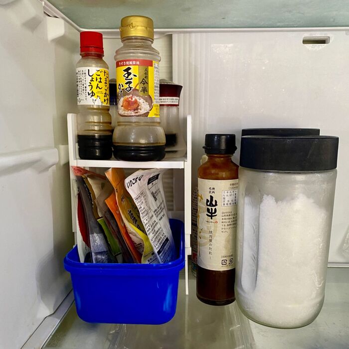 上の段には醤油差し、卵かけ専用の醤油などを乗せ、下の段には炒りごま、塩昆布、鷹の爪など細々したものを丁度良いケースに入れています。