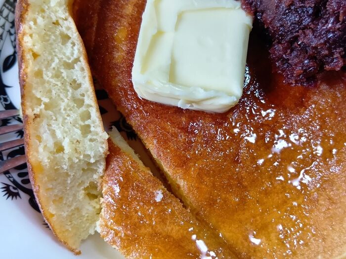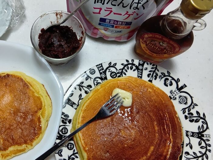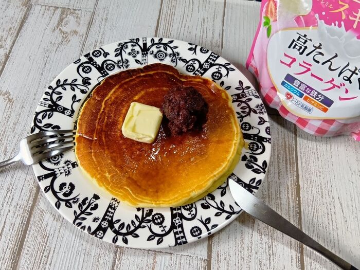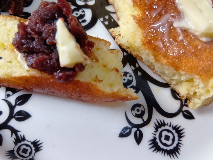 ⑥ホットケーキの表面に、柔らかくしたバターを塗り広げ、四角形の固形のバターと手作り餡をのせて完成です。メープルシロップは、お好きなタイミングでかけてくださいね。