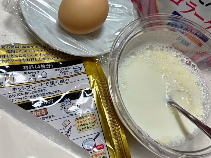 ②①にミックス粉を加えて、ダマがなくなるまでよく混ぜ合わせます。