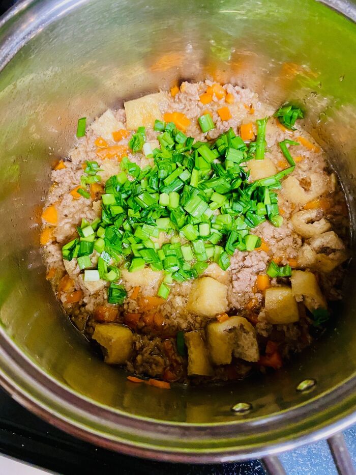 火を止めて、細く切ったニラを入れ軽く混ぜます。