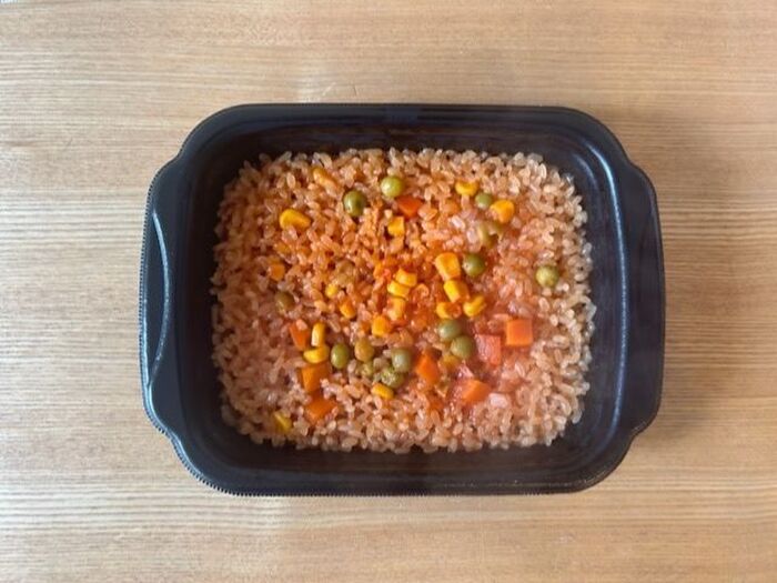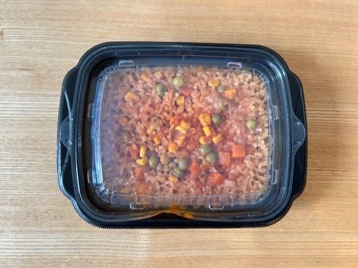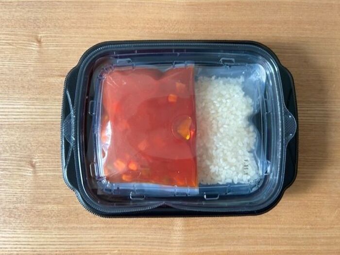 パッケージからちらりと見える中身は、生っぽいお米とトマトソース。え、これでレンジで作れるの?!気になりすぎ~!
