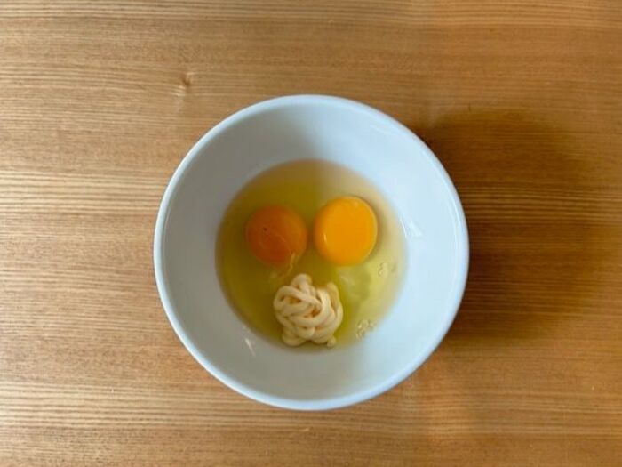 パッケージの表示によると、卵2個にお好みでマヨネーズ大さじ1を混ぜるとのこと。