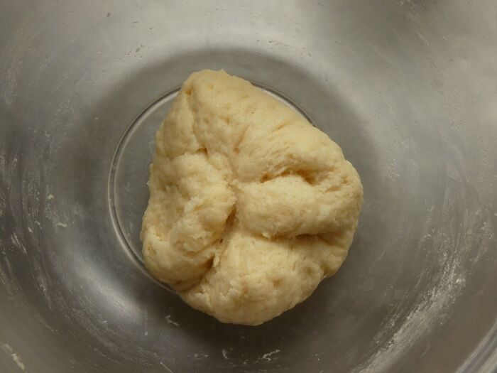 生地がまとまってきたら手でよくこねて、ひとかたまりになったらラップをかけて冷蔵庫で5分寝かせます。