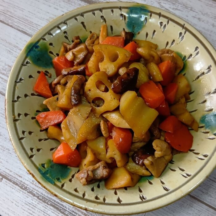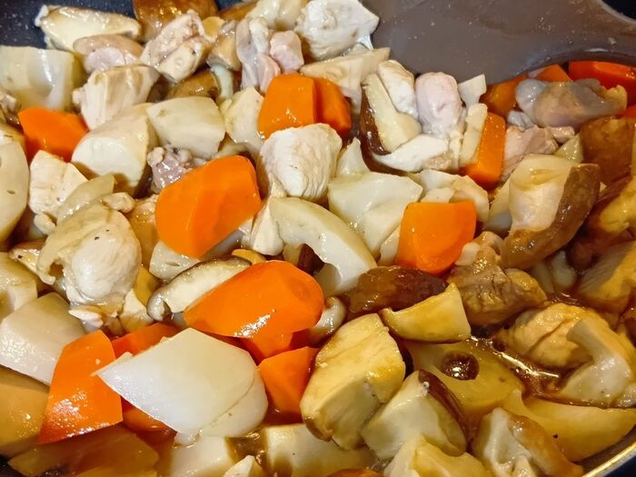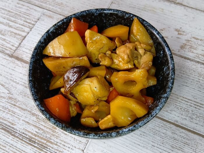 フライパンに分量外の食用油を熱し、鶏肉を入れ炒め、ほぼ火が通ったら、レンコン・人参、椎茸も加え、さっと炒めます。