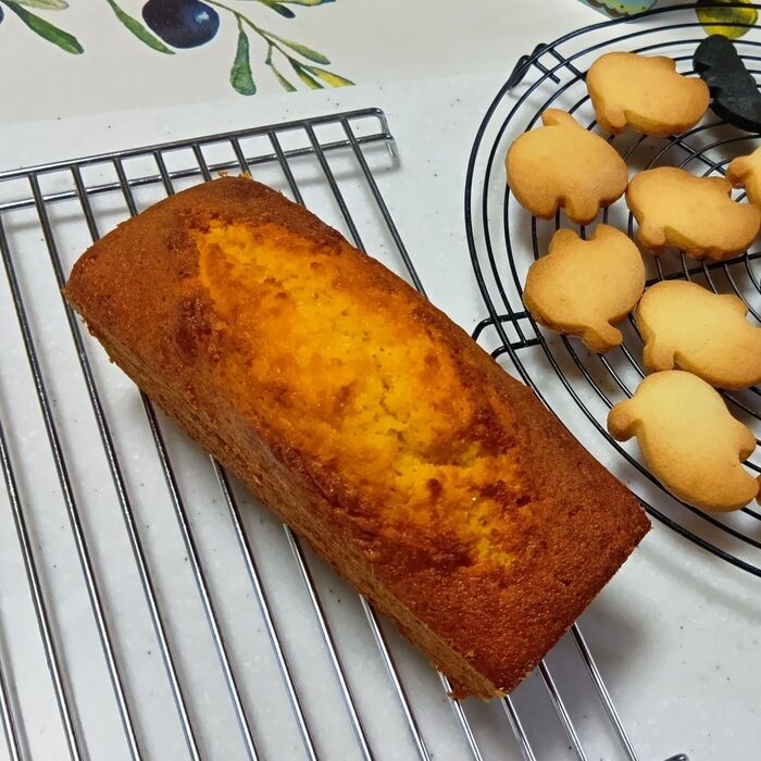 ⑤焼けたら型からはずし、ケーキクーラーにのせて完成です。