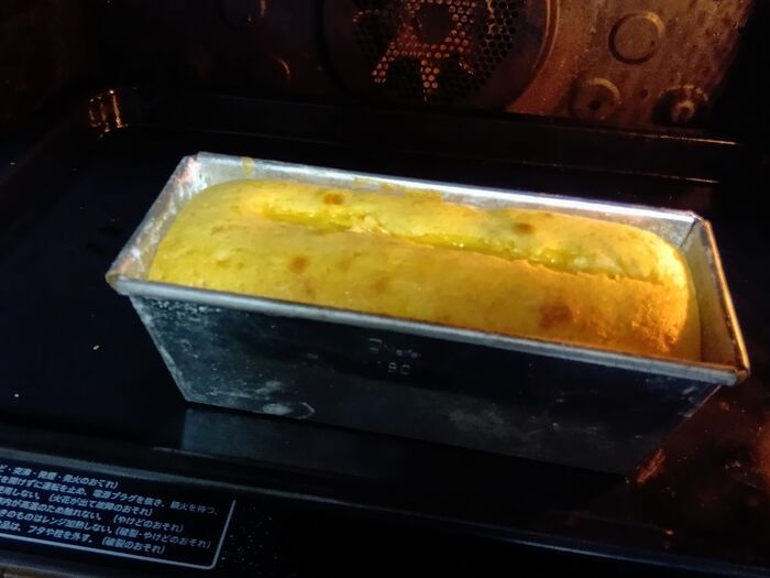 ④生地を型に入れ、天板にのせて170度のオーブンで45分ほど焼きます。45分焼くのですが、焼きはじめて15分したら、水で濡らした包丁で縦に1本切り込みを入れておきます。