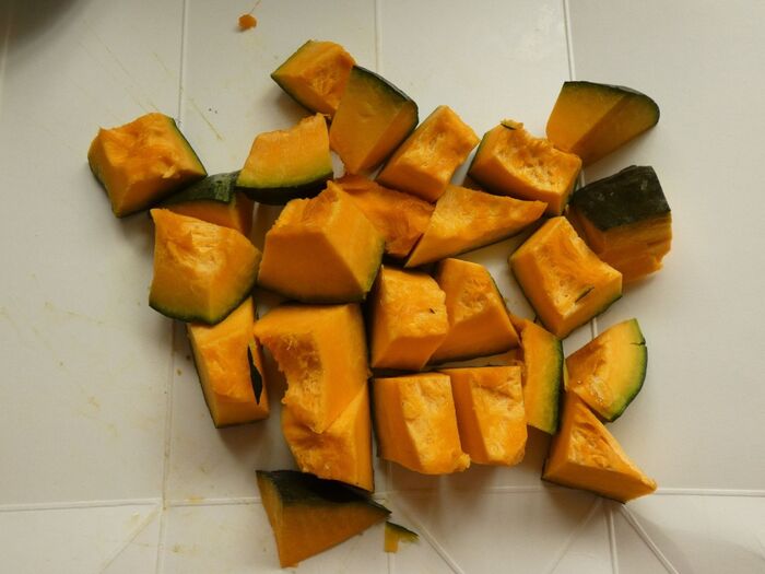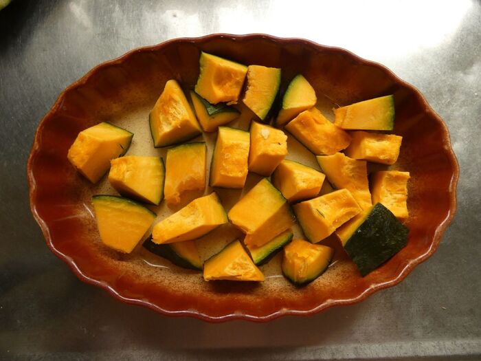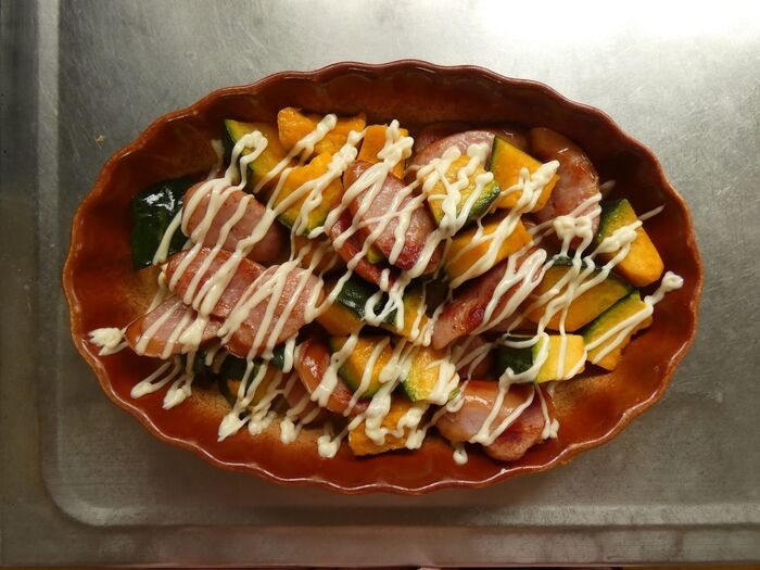 耐熱皿にかぼちゃとフランクフルトを入れ、マヨネーズをかけます。トースターで焼いて、マヨネーズがきつね色になったら完成。