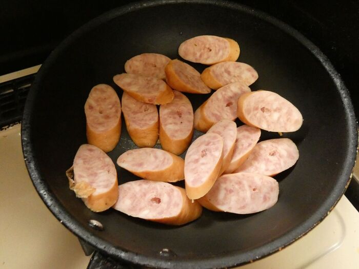 フランクフルトは斜め切りにし、フライパンで両面焼き色がつくまで炒めます。