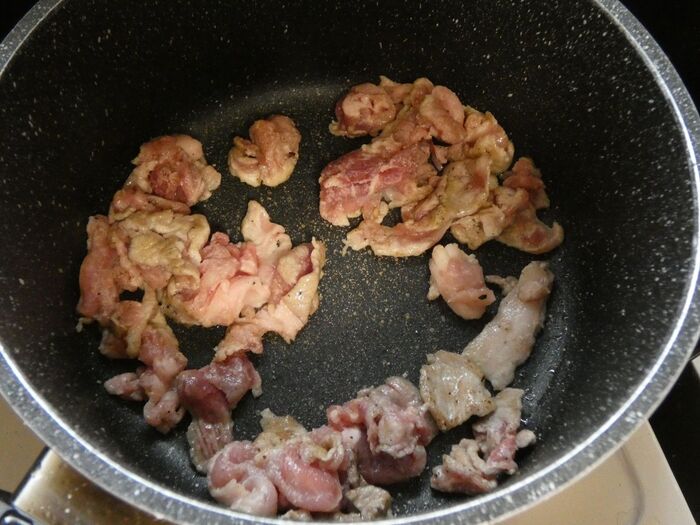 フライパンにオリーブオイルとにんにくを入れて炒めます。香りが出てきたら豚こま肉を入れて炒めます。