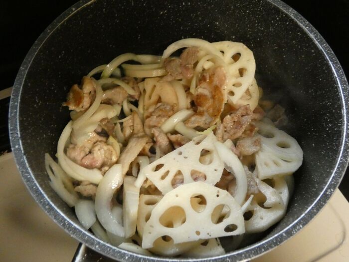 豚肉の色が変わってきたられんこんと玉ねぎを入れます。