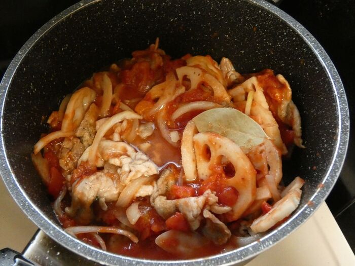 軽く炒めたらBの材料を入れ、10分煮ます。塩こしょうで味を整えて完成。