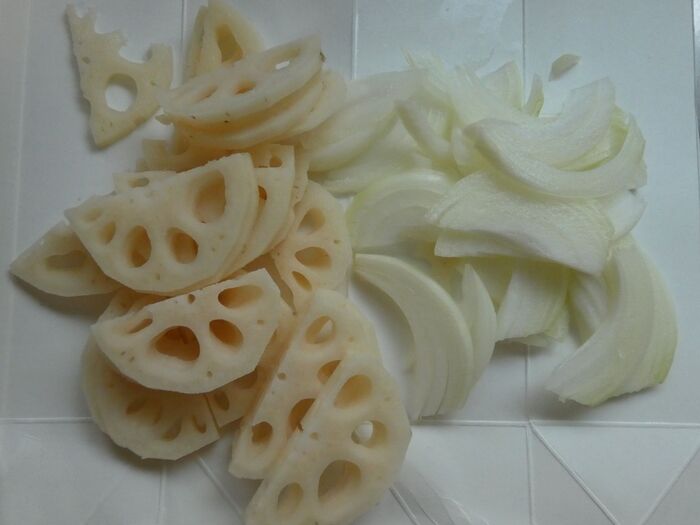 にんにくはみじん切りにし、玉ねぎは薄切り、れんこんは薄く半月切りにします。