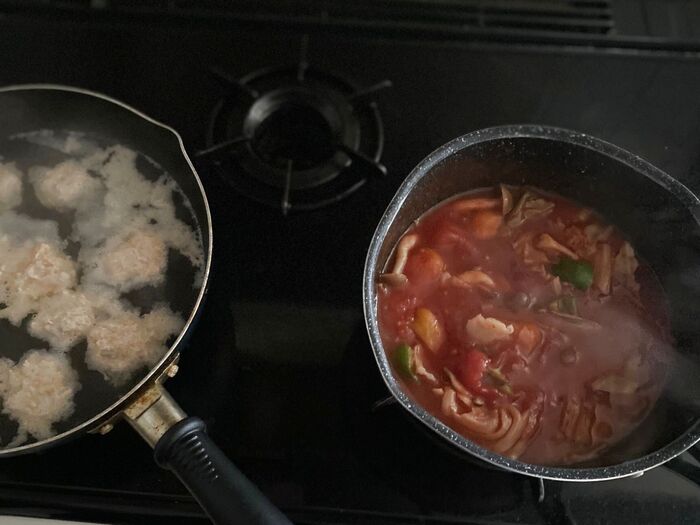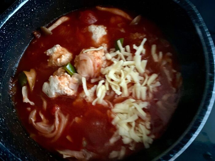 トマト鍋に、鶏団子、ピザ用チーズを入れます。