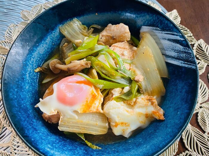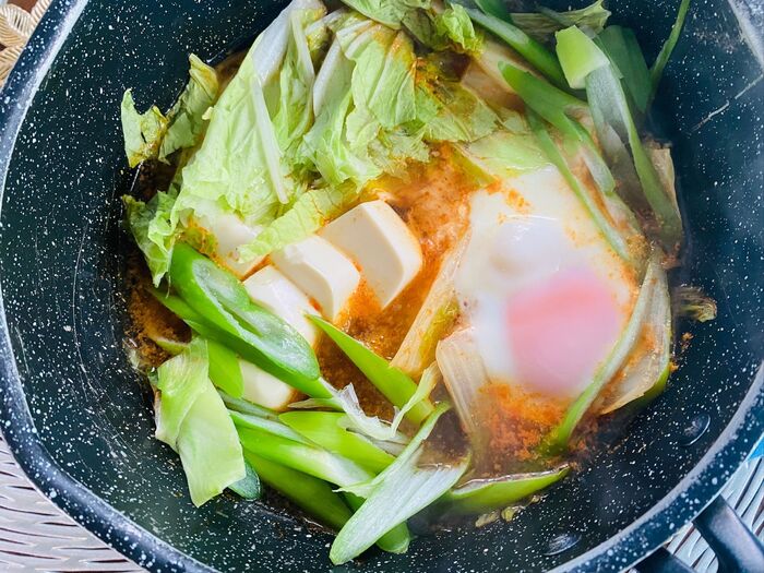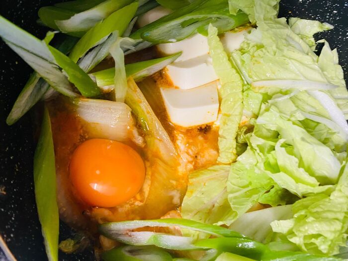火が通ったら、一口大に切った豆腐、白菜の葉とねぎの青い部分のせん切り、卵を入れます。