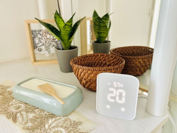 とりあえず、温湿度計としてリビングの棚に置いてみると…なかなかオシャレじゃん!