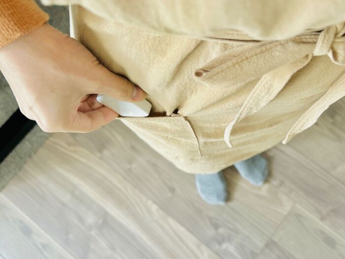2階で家事や仕事をしている時はエプロンのポケットに入れておきます。