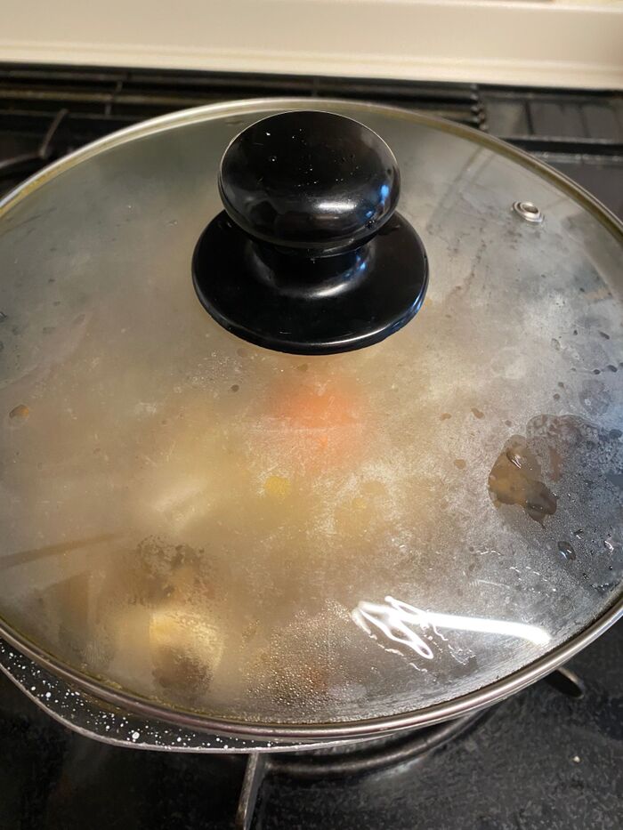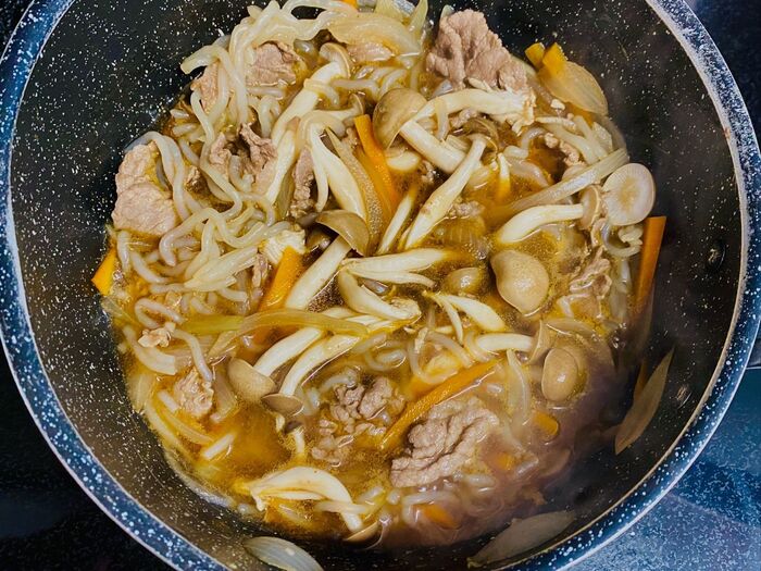 そこに櫛形切りにした玉ねぎ、短冊切りにした牛肉、人参を入れ炒めます。