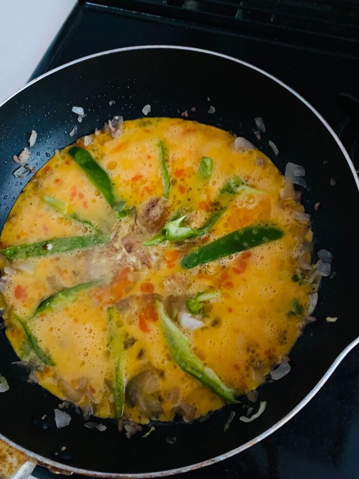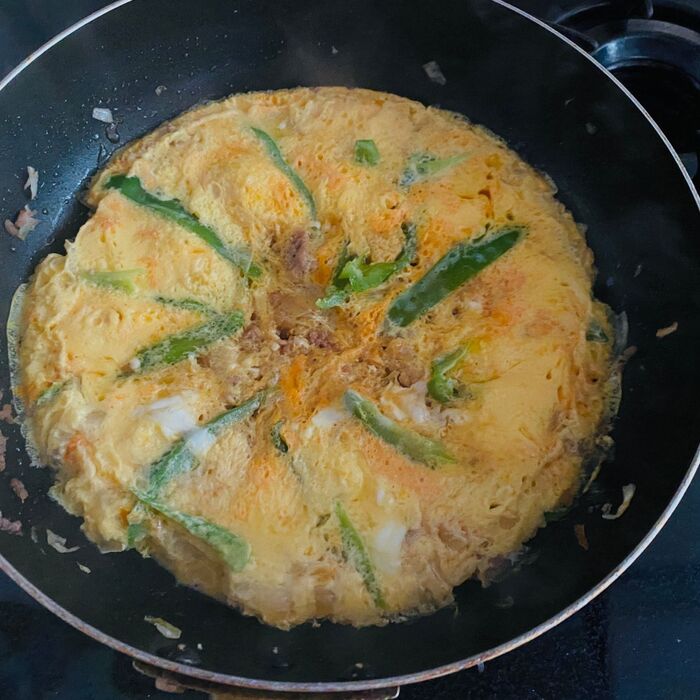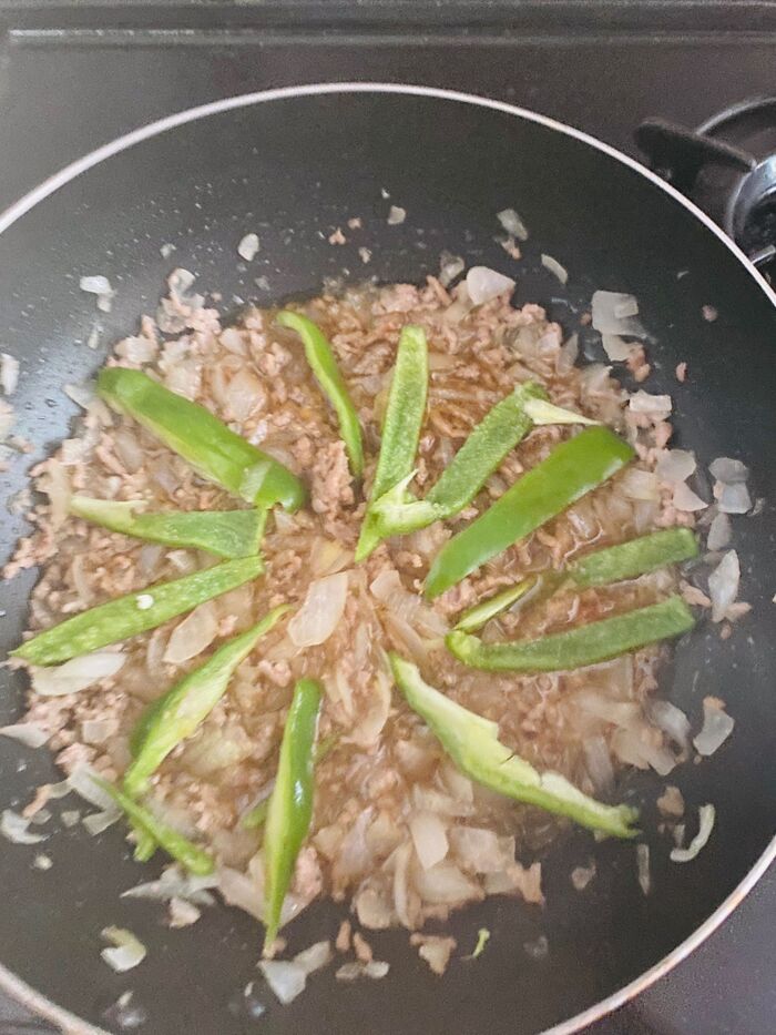 火が通りましたらピーマンのせん切りを円を描くように並べます。