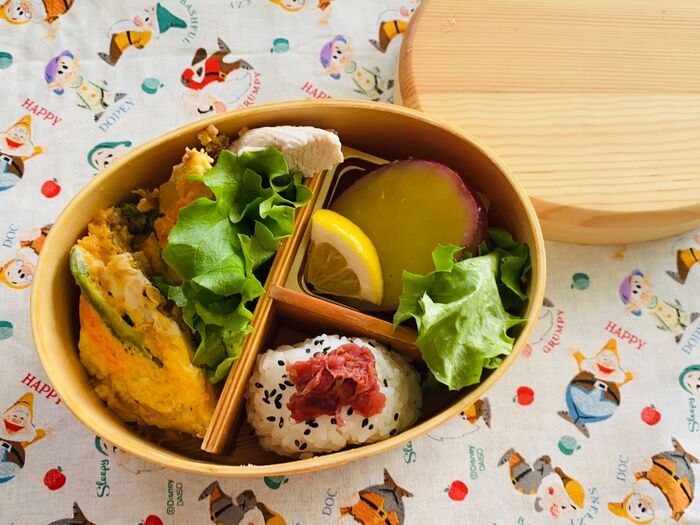 お弁当にも、韓国風オムレツ、鶏ハム、さつま芋のレモン煮、おにぎり(梅ごま)を詰めてみました。
