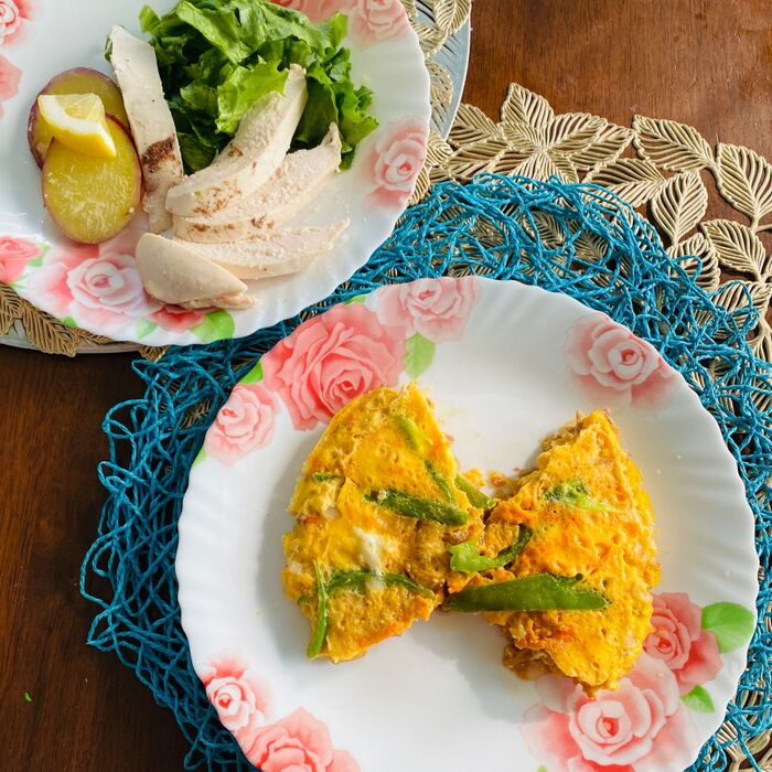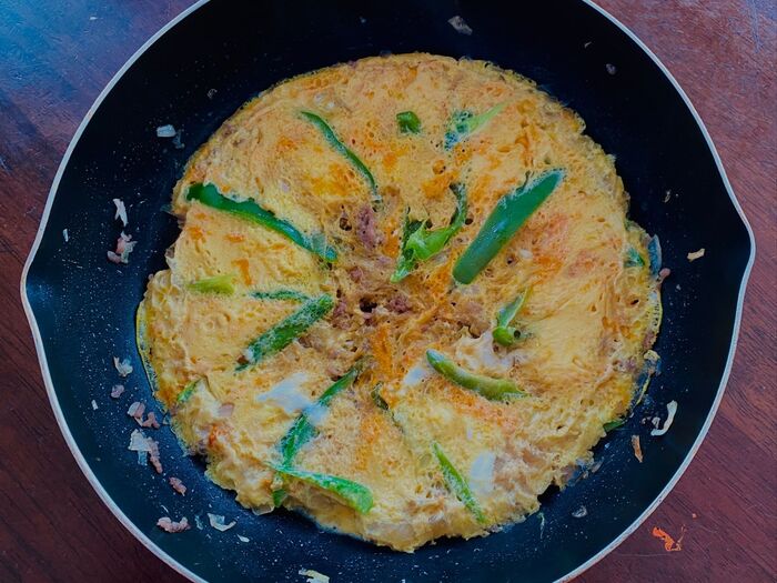 ダイニングテーブルに鍋敷きを敷いてフライパンごと出し、取り分けて食べてもOKですよ。