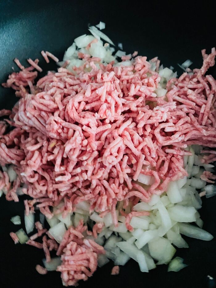 玉ねぎのみじん切り、豚ひき肉を入れよく炒めます。