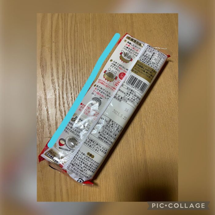 今までは袋の上部(水色の線のところ)を切っていた、乾麺の袋。ここを切ると使いかけでしまっておきたい時、袋の口をうまくとめることができませんでした。
