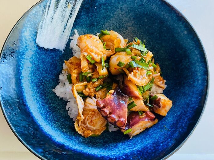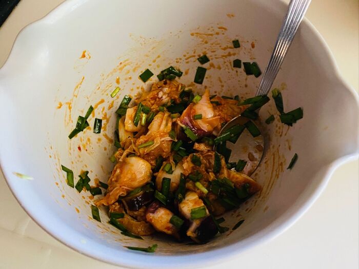 ② ①に、ぶつ切りにしたタコやホタテを予めエバラキムチの素で和えたものを加えよく混ぜます。