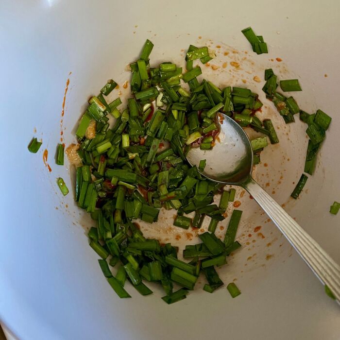 ④お好みですが、卵を乗せ、よく絡めてお召し上がりください。