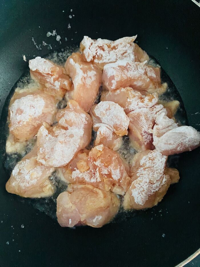 コーンスターチをまぶし中温で揚げ焼きします。