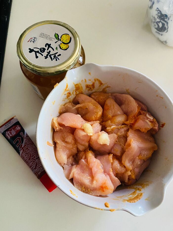 鶏胸肉は一口大に切り塩胡椒、酒を加えよく揉みます。
