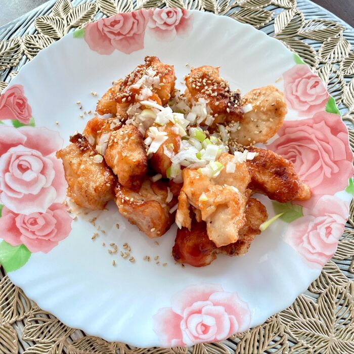 揚げ焼きした鶏胸肉を絡めます。