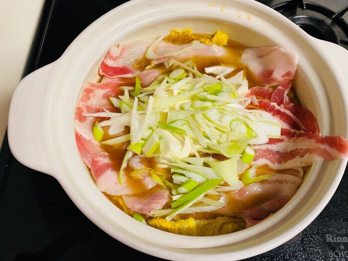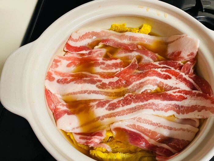 蓋をして豚バラ肉に火が通りましたら、取り分けてお召し上がり下さい。