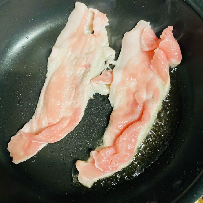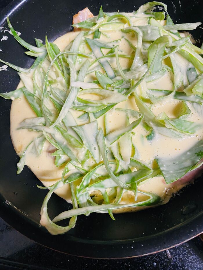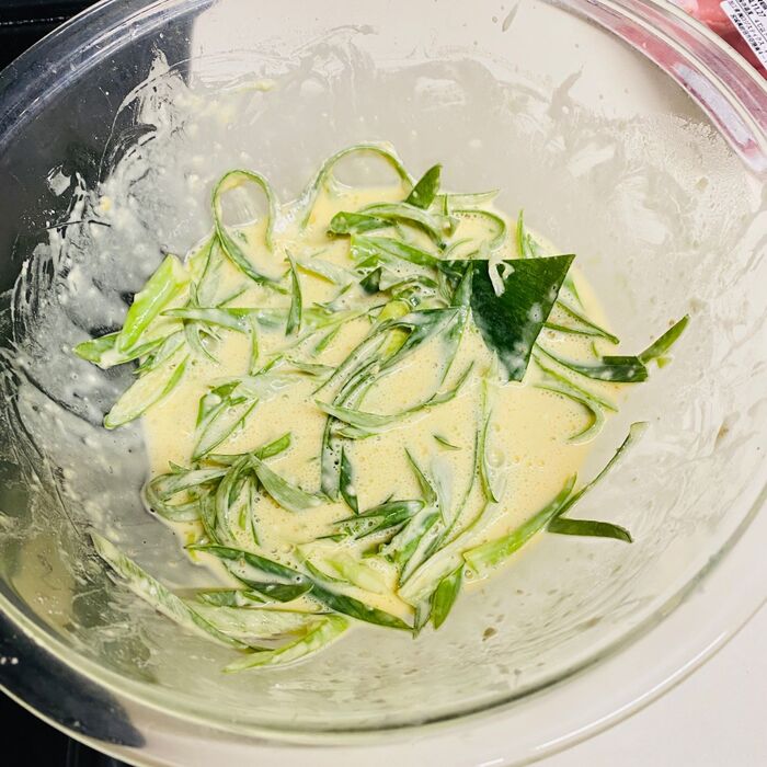 ①ボウルに卵を割り入れよく混ぜます。水、ホタテ出汁を加えよく混ぜます。せん切りにした青ねぎを入れ混ぜます。