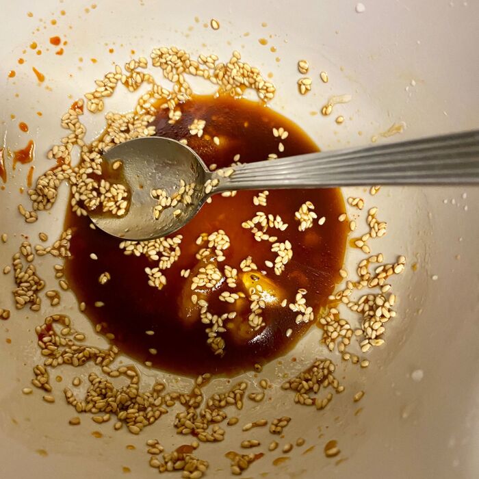 ⑥ボールに、醤油、ごま油、酢、コチュジャンを入れよく混ぜます。タレの完成!