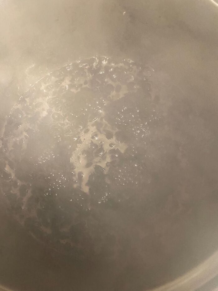 ② ①を、わかりにくいですが強火で煮ます。ふきあがってきたら、中火にして、しばらく火にかけます。