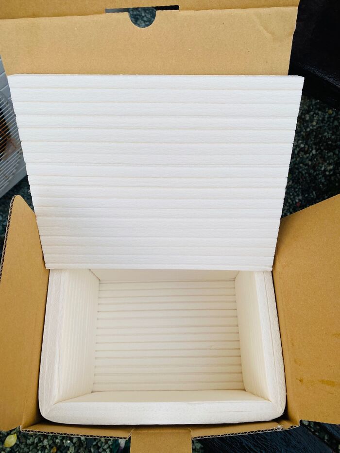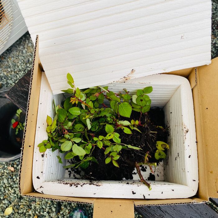 こういった時の為にとっておいいた発泡スチロールの容器に、薔薇をフラワーポットから外して入れます。