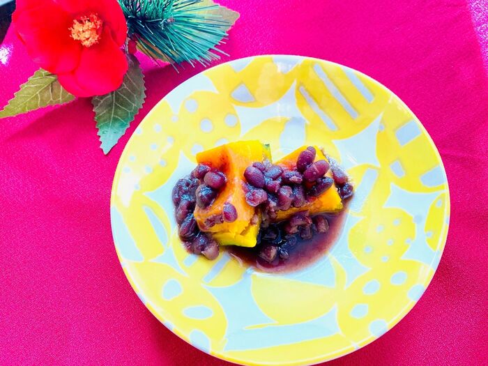 かぼちゃを塩とみりんで煮て、「粒あん」をかけて簡単に冬至かぼちゃを用意しました。