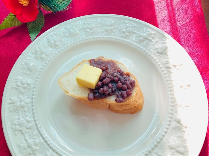 軽くトーストしたパンに粒あんとバターを乗せました。