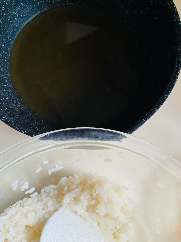 ご飯を加え、しゃもじで鍋底から切るように混ぜます。