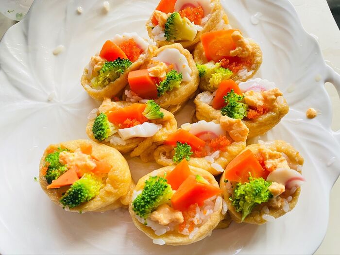 口を開いたままにして、冷蔵庫にあった茹でたブロッコリーや、なると、人参、エビっ子、炒り卵などを飾ります。