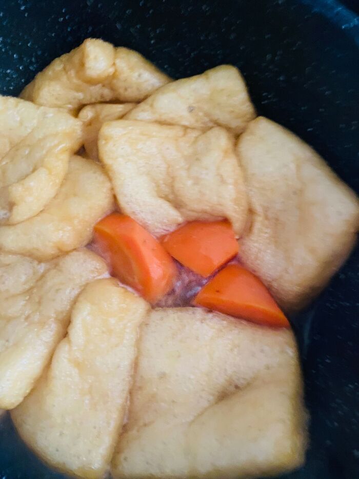 その煮汁に、予め半分に切って口を開いて、油抜きした小揚げ、人参を3切入れます。