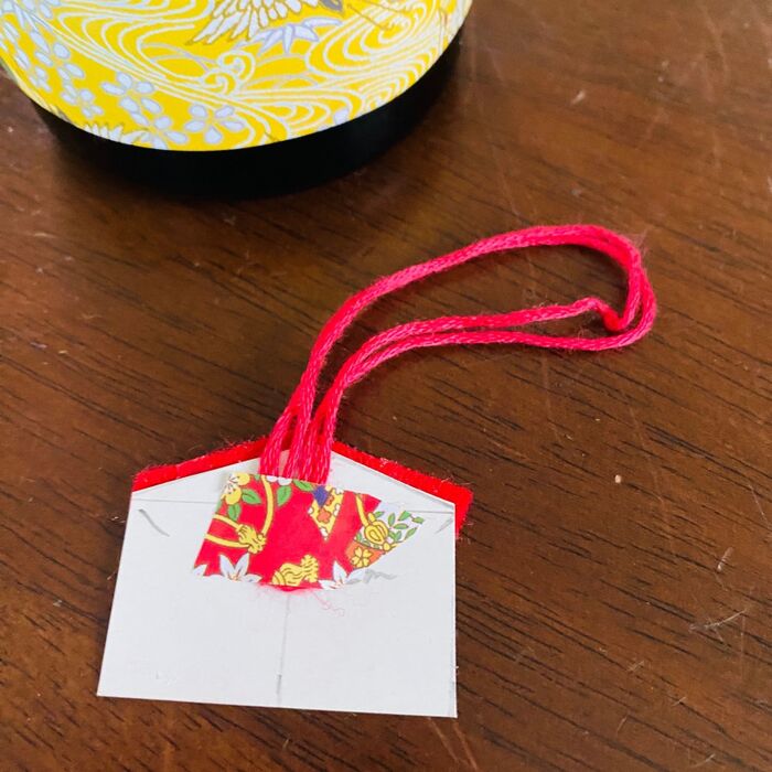 絵馬の表側に千代紙で玉手箱の絵柄があったので貼りました。