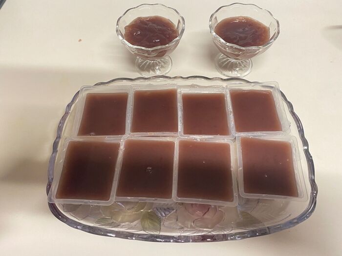 そのままでも固まりますが、冷蔵庫で冷やして固めた方が美味しいので、冷蔵庫で一晩冷やします。
