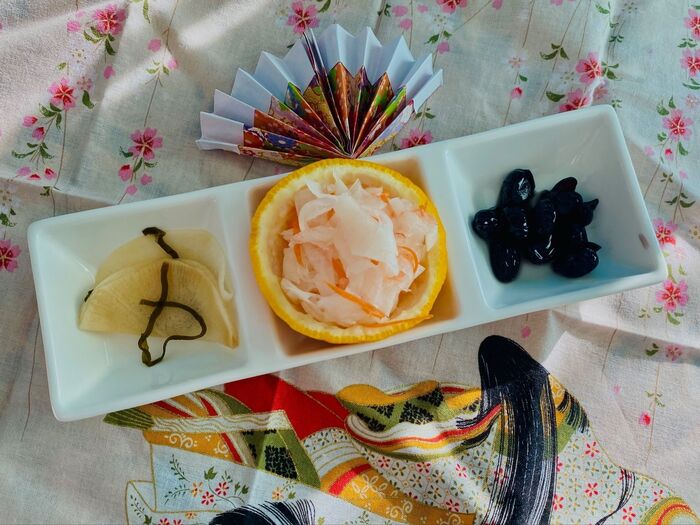 こんな感じで、千枚漬け、紅白なます、黒豆を盛り付けて見ました。