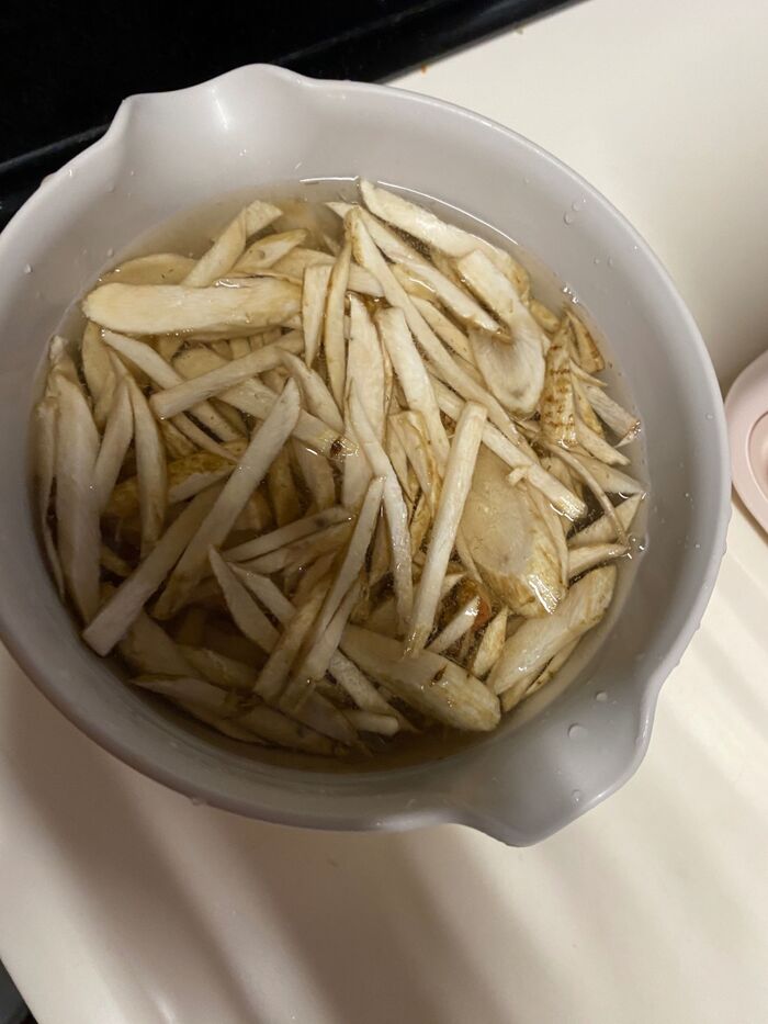 ごぼうは皮を剥き、せん切りにして酢水に浸けてアクをとります。
