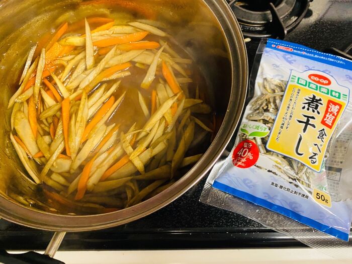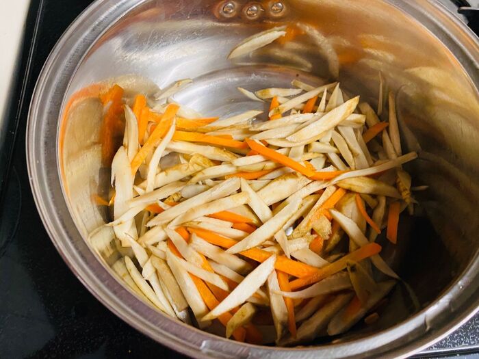 鍋に油を入れ、ごぼうのせん切り、にんじんのせん切りをいれ炒めます。