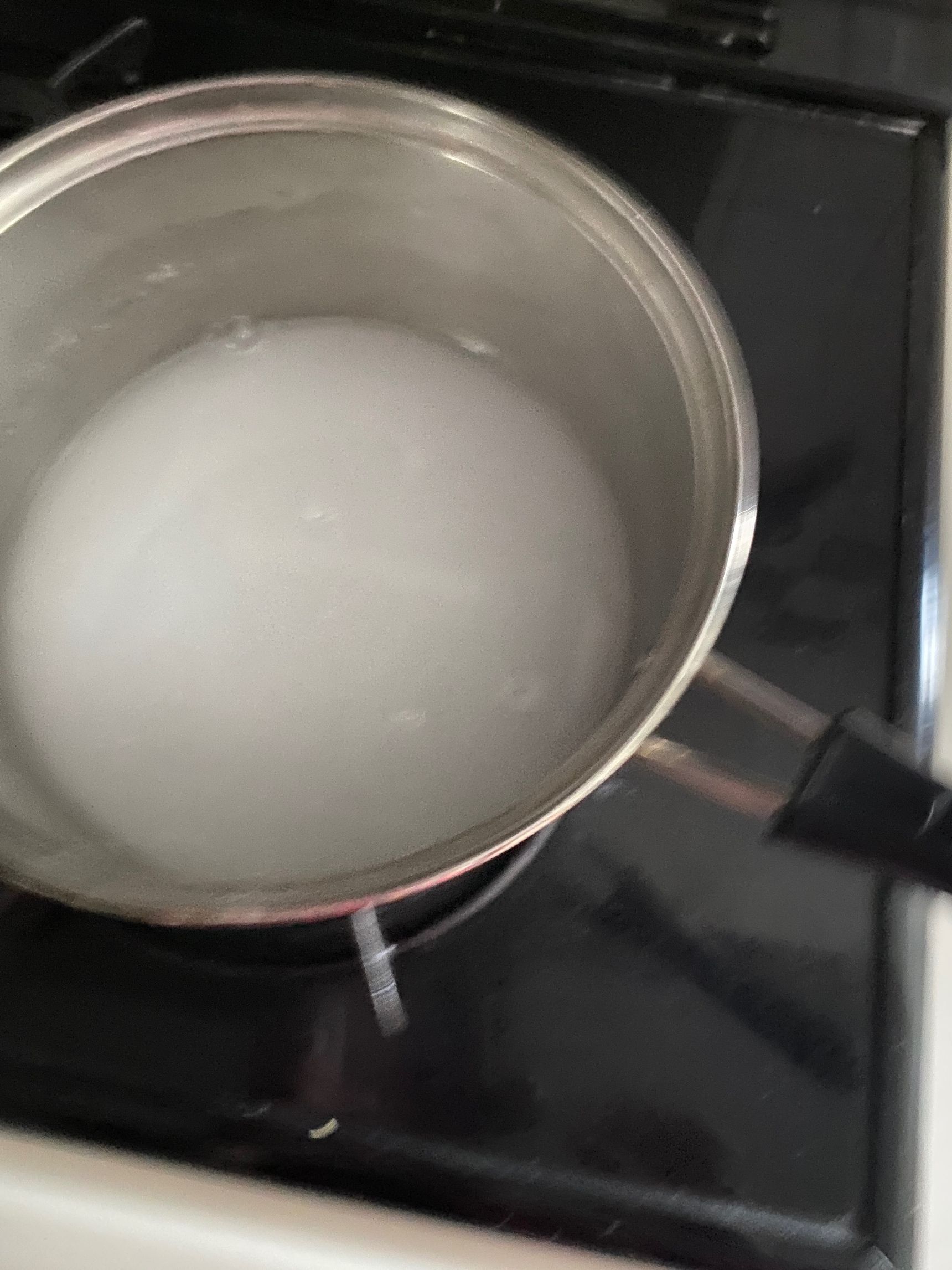 これに、砂糖大さじ4、抹茶粉末2g、ゼラチン5gを加えよく混ぜながら火にかけます。